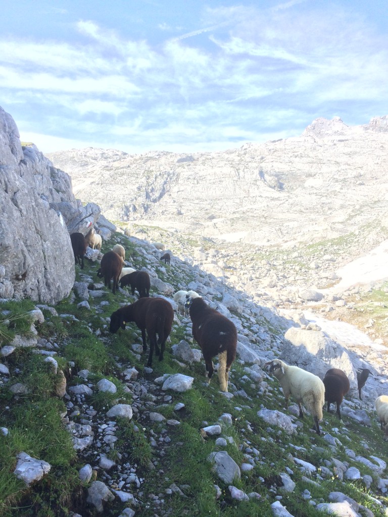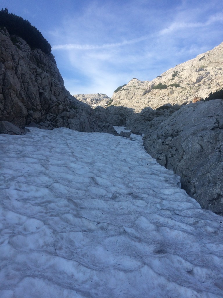 Am zweiten Tag folgt zur Erholung einer kürzere Tour: Es geht weiter zum Riemannshaus. Dabei kann sowohl der westliche, als auch der östliche Weg gewählt werden. Ich habe, wie oben zu sehen, den Westlichen genommen. Hier lag bis in den August hinein noch viel Schnee, Grödel sind von Vorteil. Vom Kärlingerhaus geht es zunächst am Hang entlang, mit bestem Blick auf den Watzmann, hinein ins Steinerne Meer. Neben viel Altschnee kommen immer wieder größere Felspassagen, meist gut mit Markierungen versehen. Neben Schafen begegnet man in den Senken nur Murmeltieren, sodass man sich über den Trubel am Riemannshaus fast schon freut. Letzteres liegt spektakulär am Hang mit Blick auf Maria Alm.