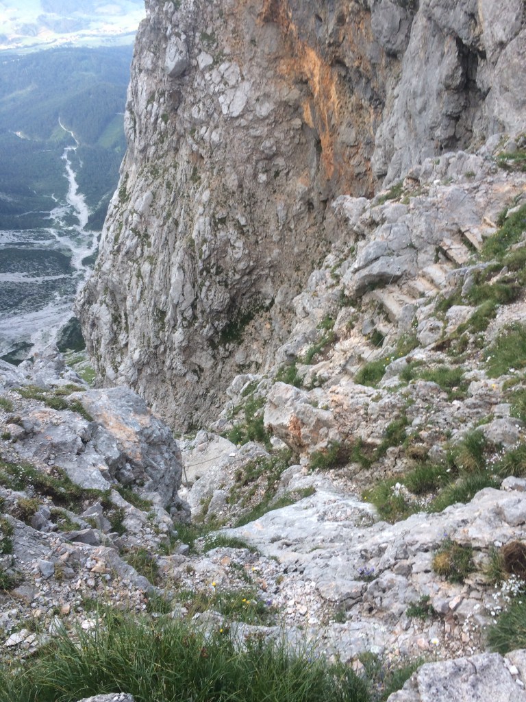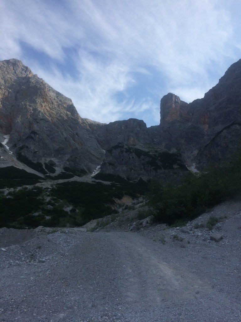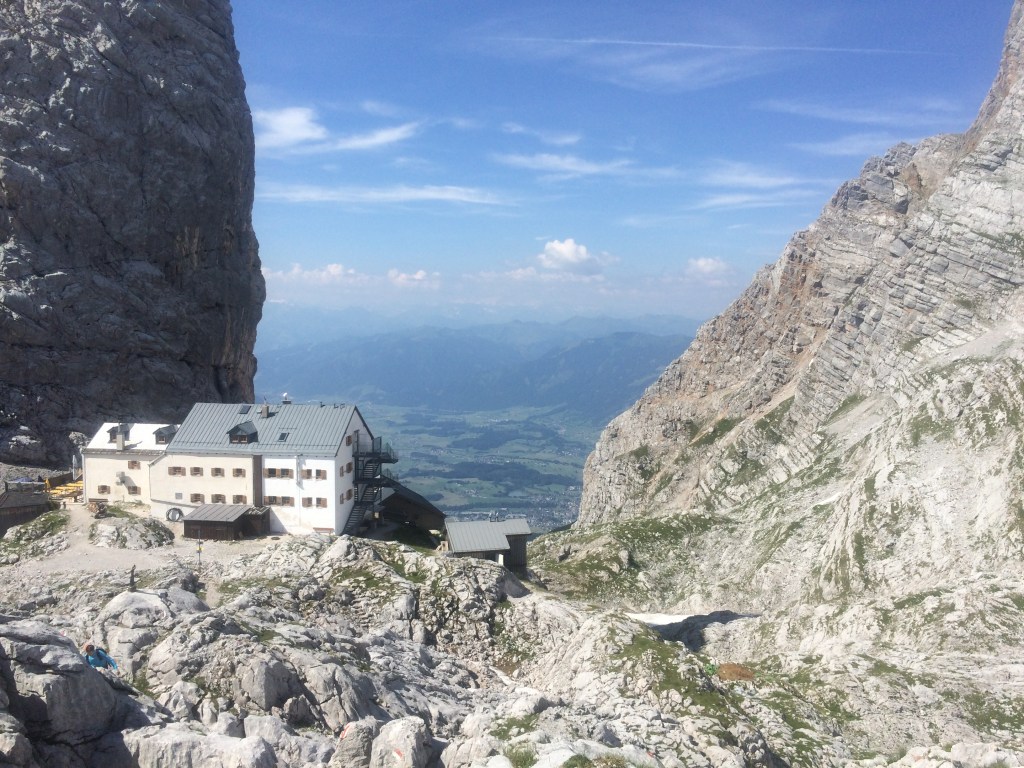 Vom Riemannshaus geht es hinab nach Maria Alm. Über einen ausgesetzen, in wenigen Teilen versicherten Steig, geht es zügig ins Tal. Schließlich gelangt man auf eine breitere Forststraße, wobei der Schotter aufgrund der Wegneigung rutschig ist. An der Straße angekommen freuen sich die Knie über eine Pause, der Blick zurück zeigt die Gewaltigkeit des Abstiegs.