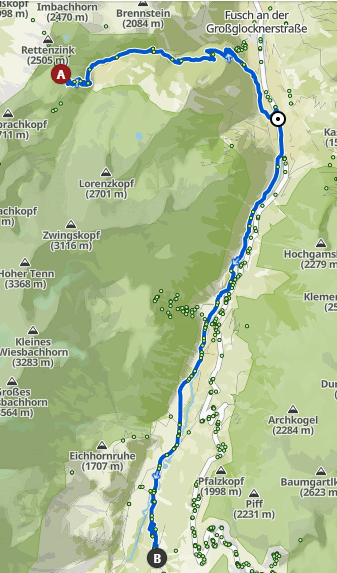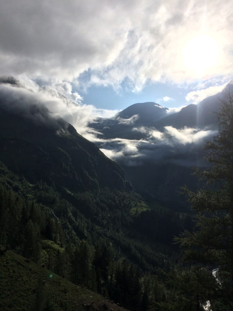 Aufgrund voll belegter Hütten und eines Gewitters ging es von Maria Alm mit dem Bus weiter nach Fusch, um bei schlechtem Wetter nur einen kurzen Aufstieg zur Gleiwitzer Hütte absolvieren zu müssen. Wer besseres Wetter hat, kann von Maria Alm über das Statzerhaus nach Bruck wandern und von dort zur Gleiwitzer Hütte aufsteigen.