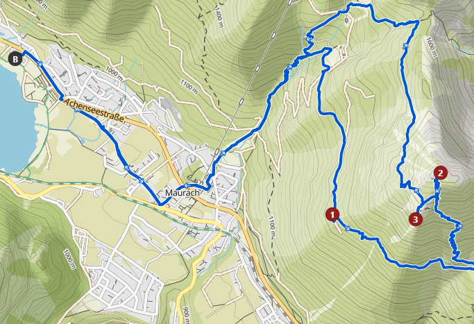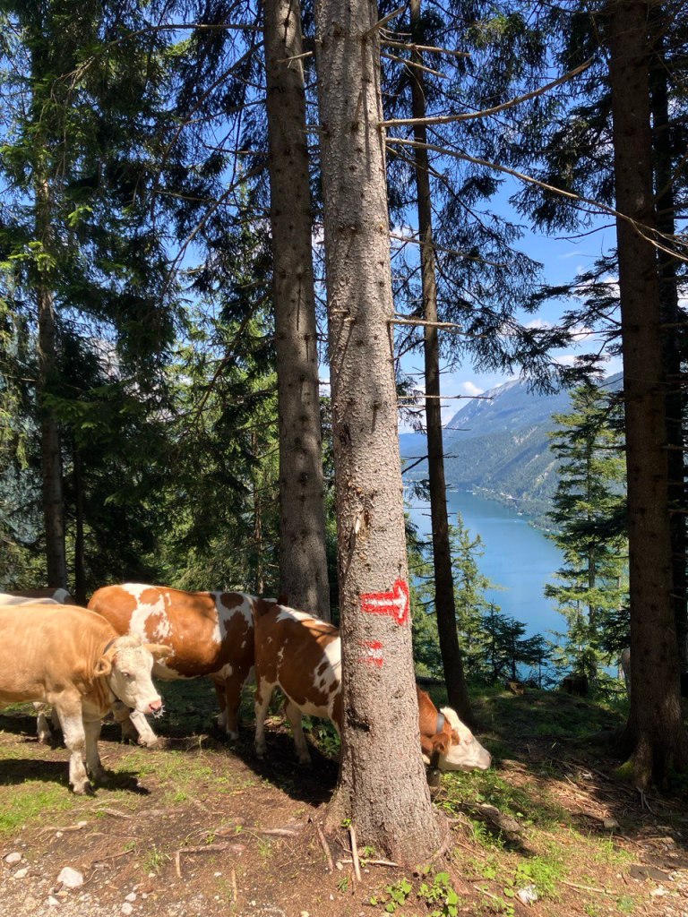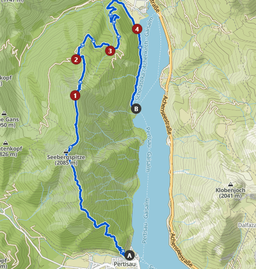 Von Pertisau aus geht es zunächst in Serpentinen im Wald den Hang zur Seebergspitze hinauf. Der Weg ist rot gekennzeichnet und gibt immer wieder einen schönen Blick auf den See frei. Schließlich wird es immer lichter, über eine Wiese und schließlich den steinigen Bergkamm wird das letzte Stück zum Gipfel zurückgelegt. Nun ist neben der Nordkette des Karwendels, der Achensee in ganzer Pracht mit dem dahinter liegenden Rofangebirge zu sehen. Im Hintergrund ertönt das Schiffshorn auf dem Achensee, ein rundum schönes Gipfelerlebnis. Auf dem teilweise ausgesetzten Grat geht es auf schwarzem Bergweg weiter zur Seekarspitze. Auf und ab, den Gipfel stets im Blick. Nach einer verdienten Pause beginnt der Abstieg steinig mit viel Geröll, bis man mit müden Beinen die Seekaralm erreicht. Eine Jause hier ist sehr zu empfehlen! Anschließend geht es über die Forststraße hinab zum Achensee und direkt am See entlang Richtung Pertisau. Der Gaisalmsteig ist mit einigen Treppen versehen, die letzten 5,5km lassen sich ab der Gaisalm mit dem Schiff abkürzen.