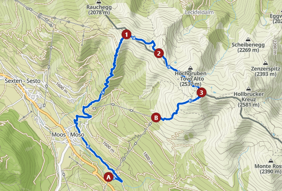 Als Start bietet sich die Talstation der Drei Zinnen Bahn bei Moos an. Diese ist mit öffentlichen Verkehrsmitteln erreichbar, parken konnten wir umsonst.