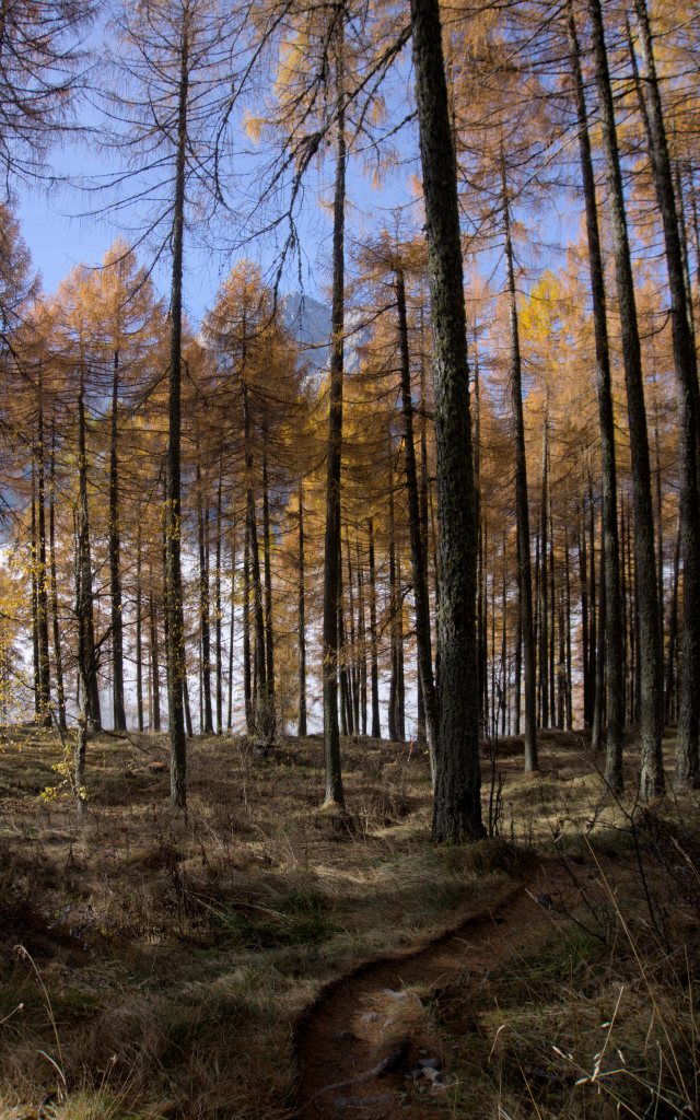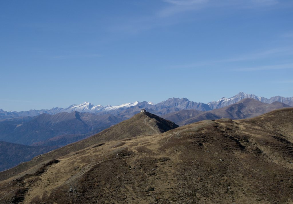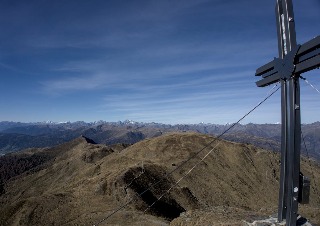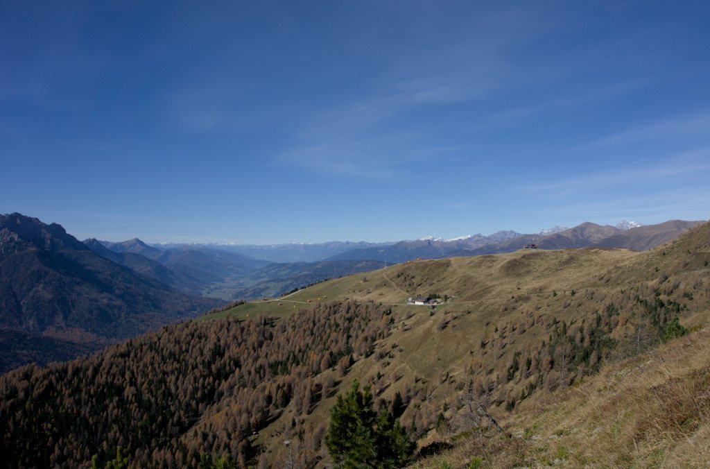 Zunächst geht es etwas oberhalb des Tales am Hang entlang Richtung Monte Elmo (der Start liegt unterhalb des Hornischegg). Der Weg führt relativ eben durch den Wald, zwischendurch kreuzt man die Skipisten. Auf einer Forststraße werden die ersten Höhenmeter in Serpentinen zurückgelegt. Anschließend bietet sich auf einer Hochebene der erste schöne Blick auf die gegenüberliegende Rotwand (s.o.). Durch einen Wald schlängelt sich der Weg nun steil immer den Kamm des Monte Elmo hinauf. Das letzte Stück zum Gipfel wird mit einer tollen Aussicht nach Westen, bei guter Sicht bis zur Wildspitze, belohnt. Eingerahmt wird das ganze im Herbst von orangener und gelber Farbenpracht. Oben angekommen enthüllt sich das von unten niedlich wirkende Gipfelhaus eher als Ruine. Überall ist zu spüren, dass es sich um einen Grenzberg zwischen Italien und Österreich handelt, überall finden sich Spuren des ersten Weltkrieges.