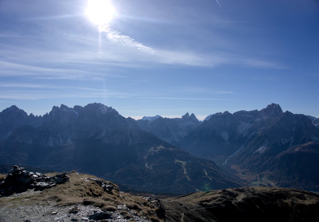 Der Monte Elmo und das Hornischegg liegen gegenüber der Sextner Dolomiten, nordöstlich von Sexten. Obwohl sie selbst eher unspektakulär wirken, ist es die Aussicht von Ihnen umso mehr.