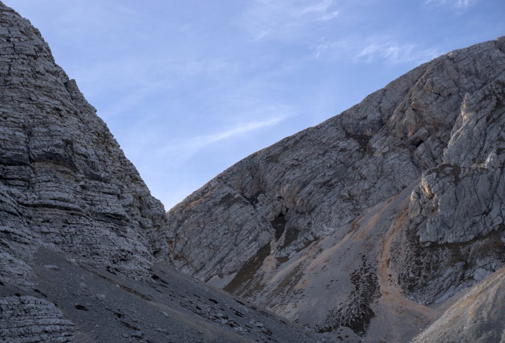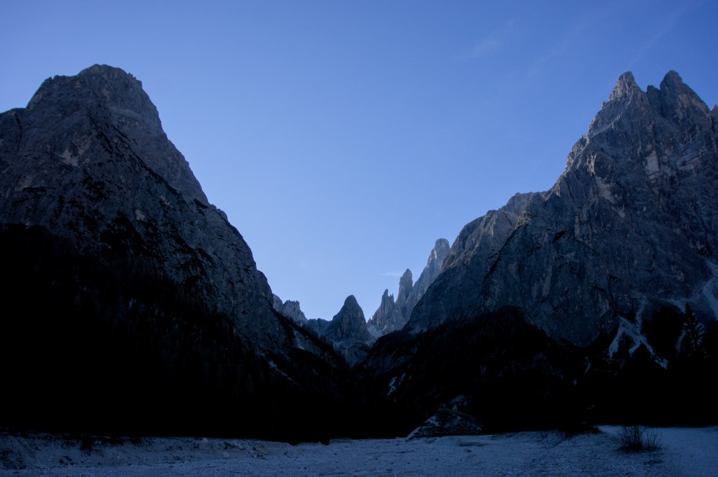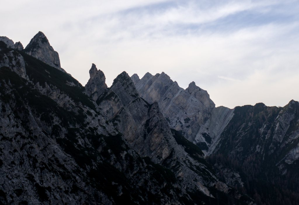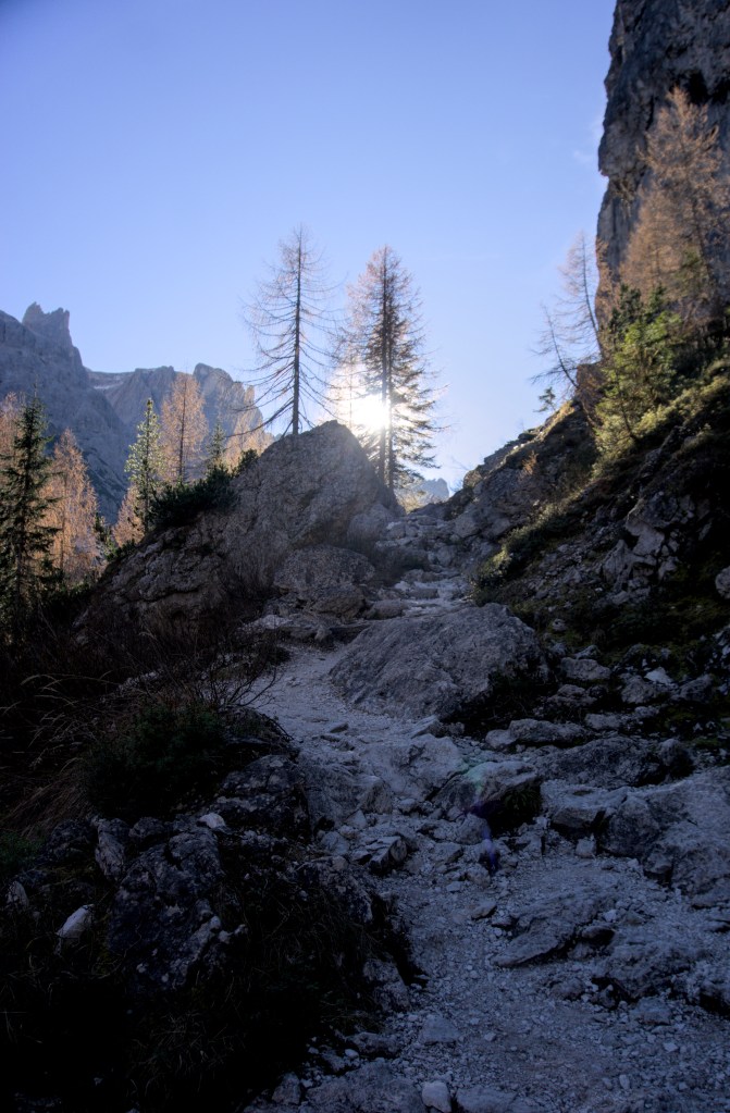 Vom Fischleintalboden geht es an einigen Gasthäusern vorbei auf einem breiten Forstweg „rein in die Dolomiten“. Neben den riesigen Felsen kommt man sich klein vor, der Forstweg zieht sich und im November ist es in diesem nördlichen Tal eiskalt, trotzdem es im Tagesverlauf am Berg fast sommerlich wird. Vor einem türmt sich der Einserkogel auf. Nach einer kleinen Brücke gabelt sich der Weg. Wir wandern den Hang hinauf und östlich am Einserkogel vorbei. Der immer weiter ins Bild kommende Zwölferkogel ist nicht weniger eindrücklich und an der gegenüberliegenden Wand meint man öfters den bekannten Alpinisteig zu erahnen. Stetig mit wunderbarem Panorama geht es in Richtung Zsigmondyhütte, an der ein Gedenkstein an Abstürze am Zwölferkogel erinnert. Auf dem Weg begegnen einem Gedenktafeln für gefallene Soldaten des ersten Weltkrieges. Beim Anblick der beeindruckenden Felsformationen kann man sich kaum vorstellen, dass hier einst jahrelange Kämpfe stattfanden.